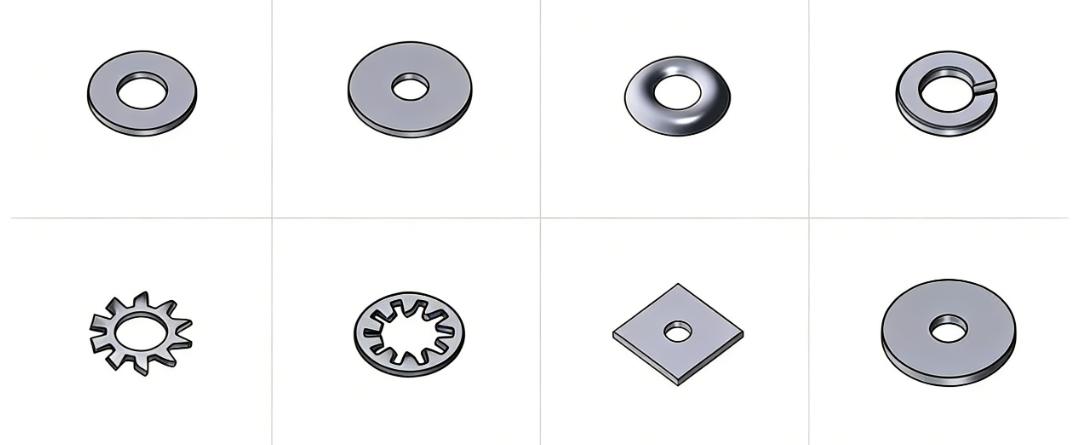 ④ Некоторые шайбы имеют специальную конструкцию, предотвращающую ослабление гаек. Обычно известные как стопорные шайбы, они бывают различных конфигураций: с прорезями, в форме звезды, в форме волны и т. д. Такие стопорные шайбы необходимо использовать вместе с гайками.
